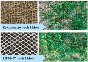 Laut Untersuchungen der BOKU kann ein LITE-NET im Vergleich zu Kokosnetzen langfristig die 6-fache Wassermenge speichern. Dies führt zu einer 50 % höheren Begrünungswirkung. Zusätzlich wird Erosion reduziert. Durch die flexible Netzform legt sich das LITE-NET sehr gut an die Oberfläche an, weshalb es nur wenig befestigt werden muss und sturmsicher ist.