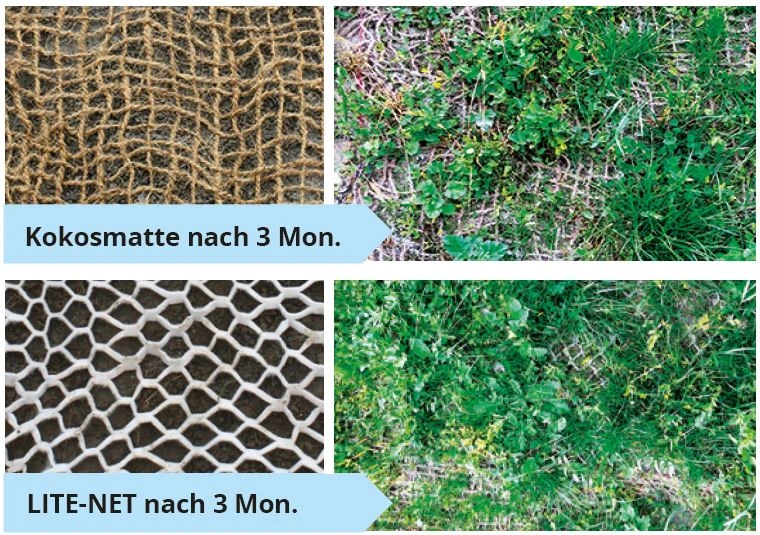 Anwachsen von Böschungen: Zur Startbegrünung wird das auseinandergezogene, biologisch abbaubare LITE-NET Bio1 oder LITE-NET Bio5 einfach auf der Böschungsoberfläche ausgelegt