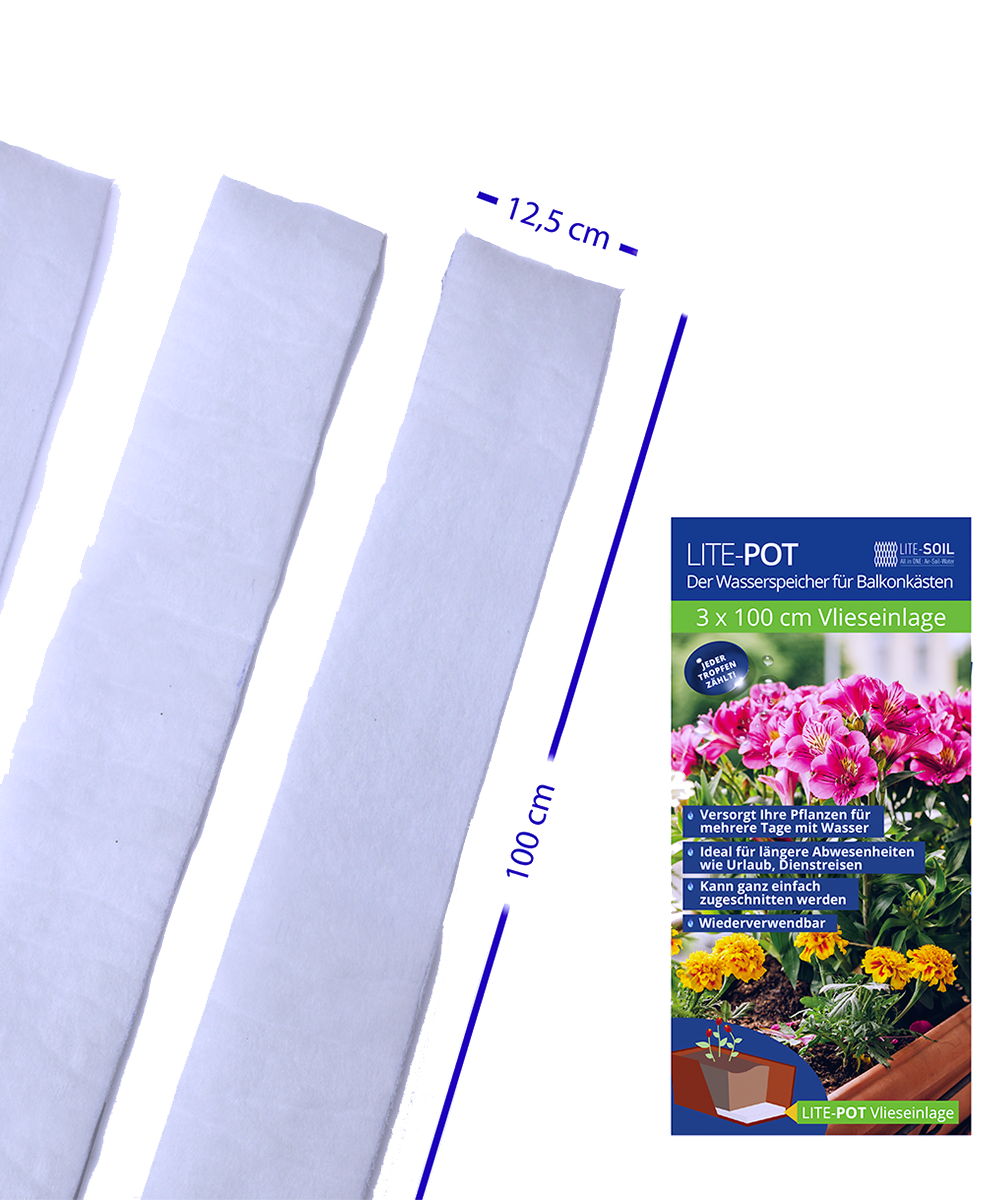 Inserto de vellón como depósito de agua para las cajas de los balcones LITE-POT L: El forro polar almacena el exceso de agua como una esponja y la devuelve a las plantas cuando la necesitan. LITE-POT L ahorra el riego diario y simplifica el cuidado de sus plantas. El vellón de almacenamiento de agua reciclada puede ser utilizado varias veces y almacena aproximadamente 12 l/m2 de agua. Hecho de 100% poliéster reciclado, fabricado en Austria.