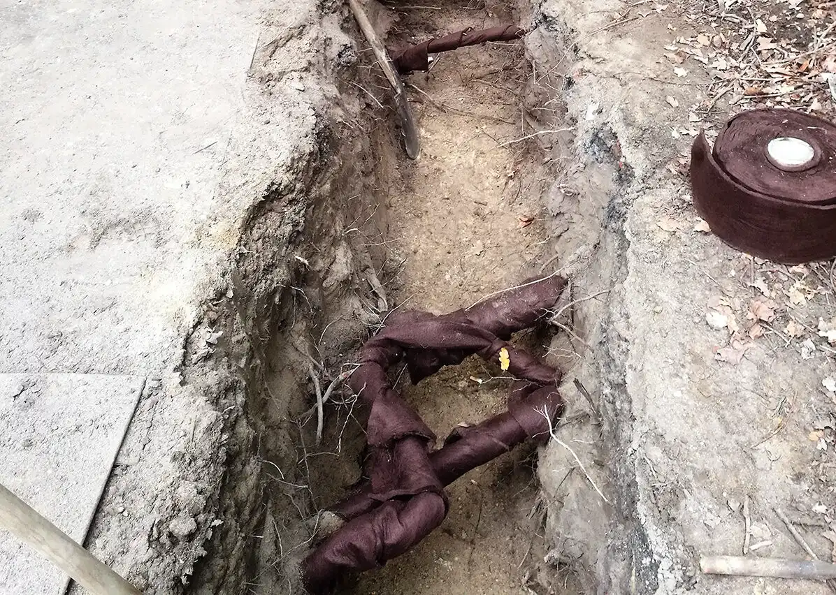 ÁRBOLES: Dependiendo del tamaño del área y del número de raíces, las raíces expuestas se cubren horizontal o verticalmente con la Cortina para Raíces LITE-ROOTPROTECT M o L, o se envuelven con el Vendaje para Raíces LITE-ROOTPROTECT.