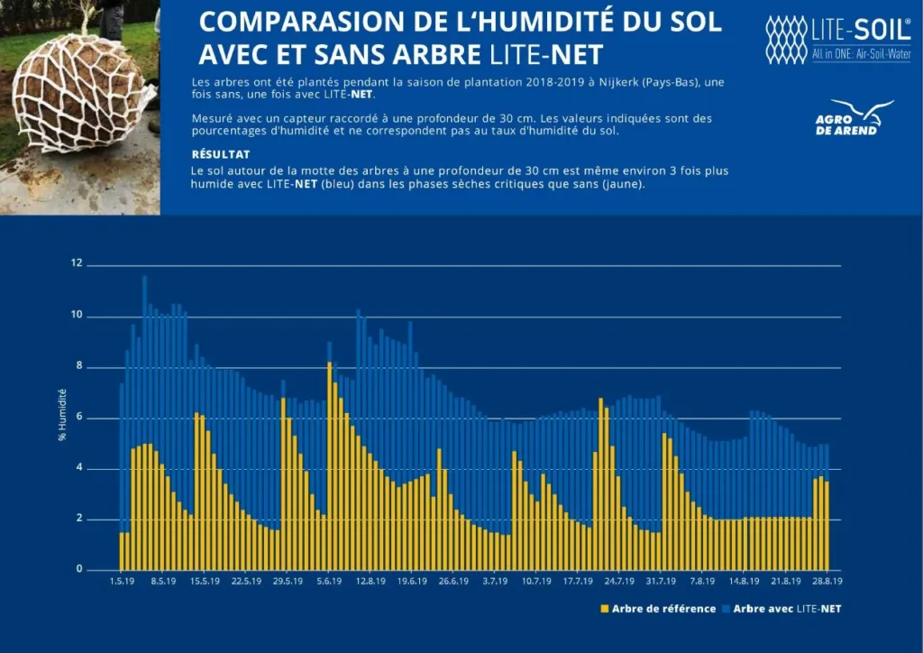 Le LITE-NET absorbe l’air & l’eau à la surface et les dirige efficacement et sur une grande surface exactement là où ils sont nécessaires : vers les racines des arbres.