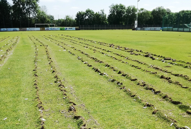 Per aerare il prato a lungo termine, potete inserire delle strisce di tessuto non tessuto (LITE-STRIPS) nei fori forati o spazzare piccoli cubetti di tessuto non tessuto (LITE-CUBES) nei fori insieme a sabbia di quarzo. Dato che questi tessuto non tessuto sono costituiti fino a circa il 90% di pori d’aria aperti e interconnessi, possono drenare molto bene l’aria e l’acqua da un lato e dall’altro fungere da riserva d’acqua. Raccomandiamo i nostri tessuti non tessuti Bio5 per questa applicazione, biodegradabili/compostabili in circa 5-10 anni.