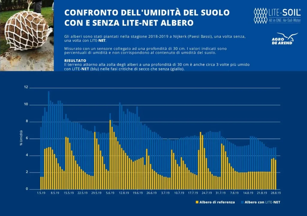 LITE-NET assorbe lโaria e lโacqua in superficie e la convoglia in modo efficiente su unโampia superficie, esattamente dove serve: alle radici degli alberi.