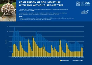 As vegetation nets, they are wrapped around root balls. They suck water into their voluminous structure at the surface and conduct it efficiently and extensively to the roots like veins. When these remove the stored water as required, air is sucked in from the surface. Thus, they simply & cost-effectively replace the previously common pipe systems without buckling, clogging and stack effect. According to Dutch studies, the use of vegetation nets also increases soil moisture by about 50 %. Because of the flexible net shape, roots can grow through it without any problems.