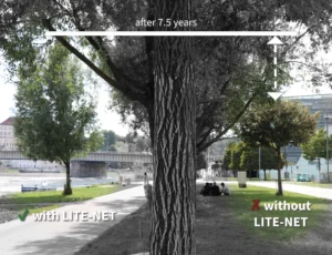 Because of their effectiveness, vegetation nets are also the ideal underground system supplement to irrigation bags and watering edges. They reduce water consumption considerably by transporting water directly to the tree roots without evaporation. Watering intervals are significantly extended.