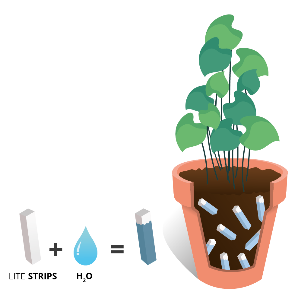 Since water storage for plants is located directly near the roots, plants can access the water more easily and effectively when needed, extending watering intervals. The elongated LITE-STRIPS absorb water from the surface to the roots, make dense soil more permeable and function as a substrate improver.
