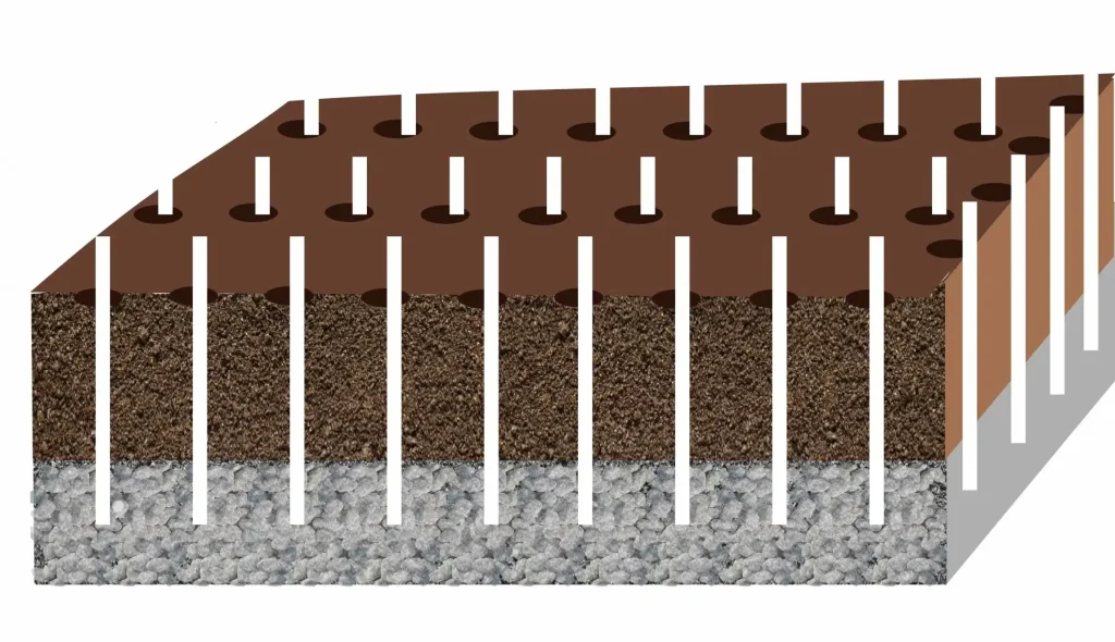 LITE-STRIPS strikes vertically. The excess water is sucked into the fleece strips and transported into the permeable subsoil. The pore structure of the thick fleece is optimized for soils rich in fine particles, so that the pores cannot clog.