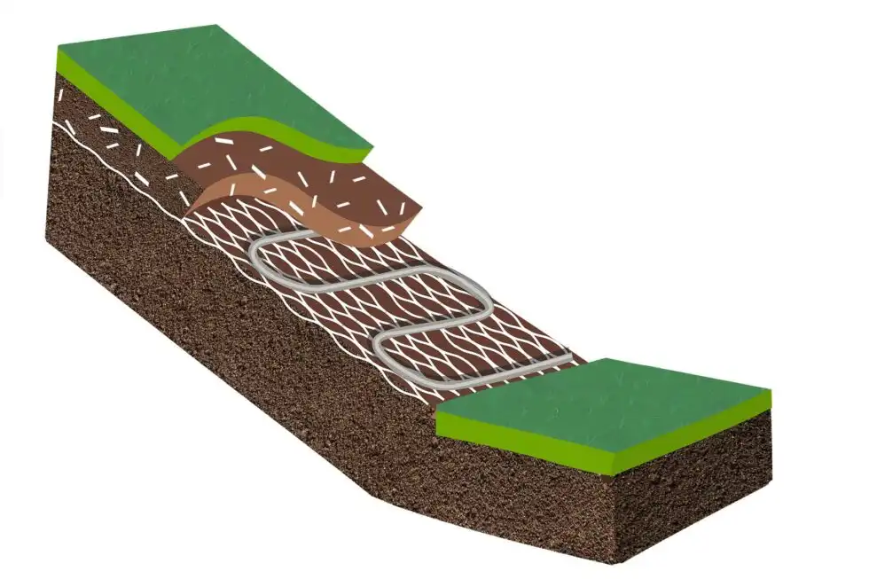 For long-term embankment revegetation, permanent LITE-NET Bio5 or PP variants are installed at root depth (approximately 10-15 cm for grass).