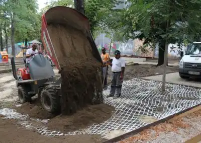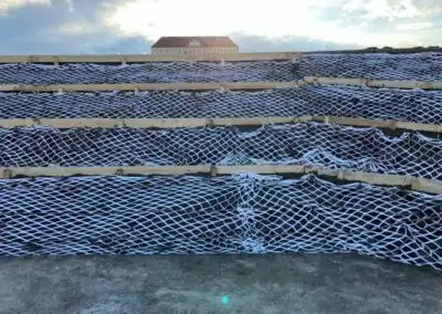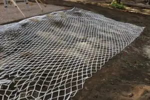 Thanks to improved plant growth and the fact that the roots grow through the openings in the net and anchor themselves to the net, the surface is stabilized over a large area. Water is distributed evenly throughout the network and stored near the roots.